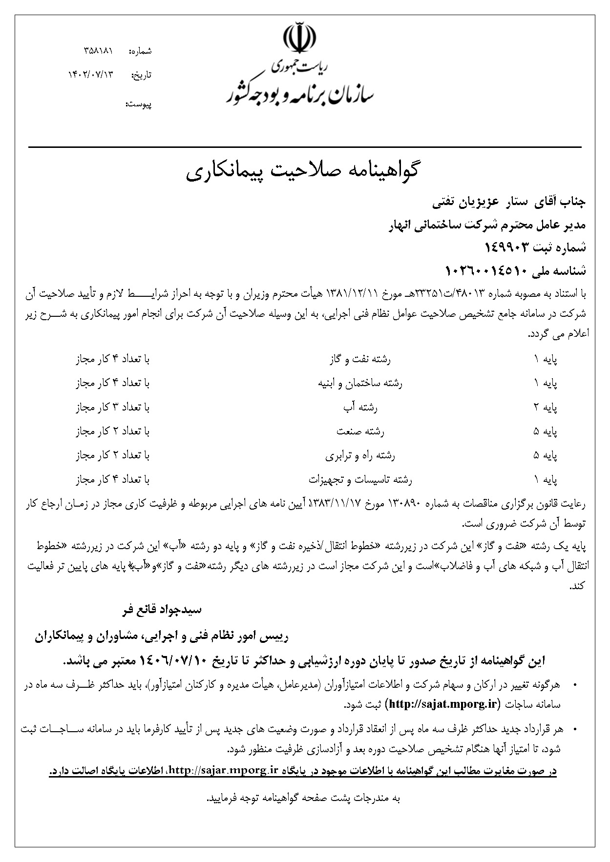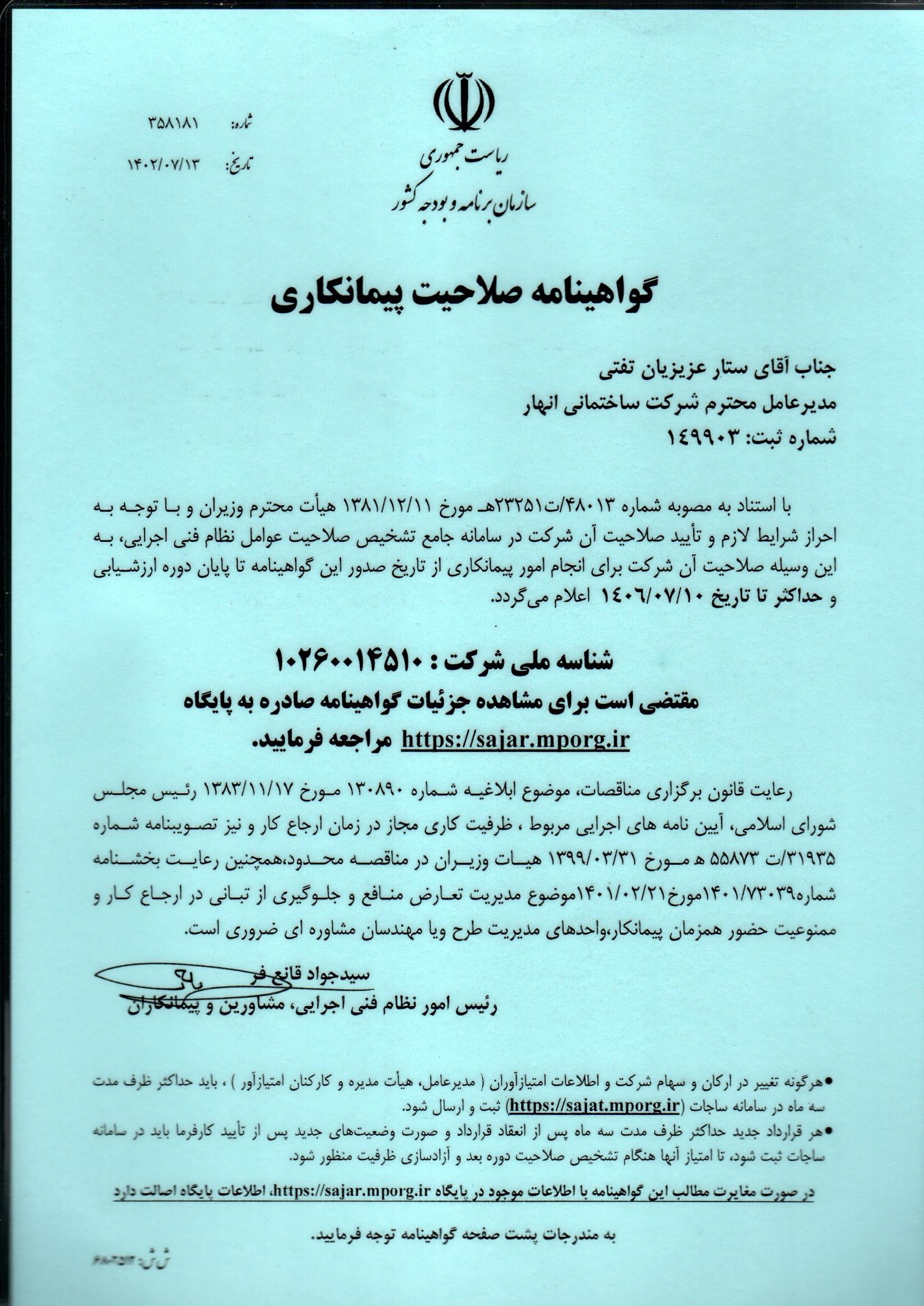 حصلت شرکة ساختماني انهار خلال سنوات متواصلة من العمل الدؤوب علی شهادة صلاحیة تنفیذ أعمال المقاولة من مؤسسة التخطیط والمیزانیة الوطنیة في المجالات التالیة :