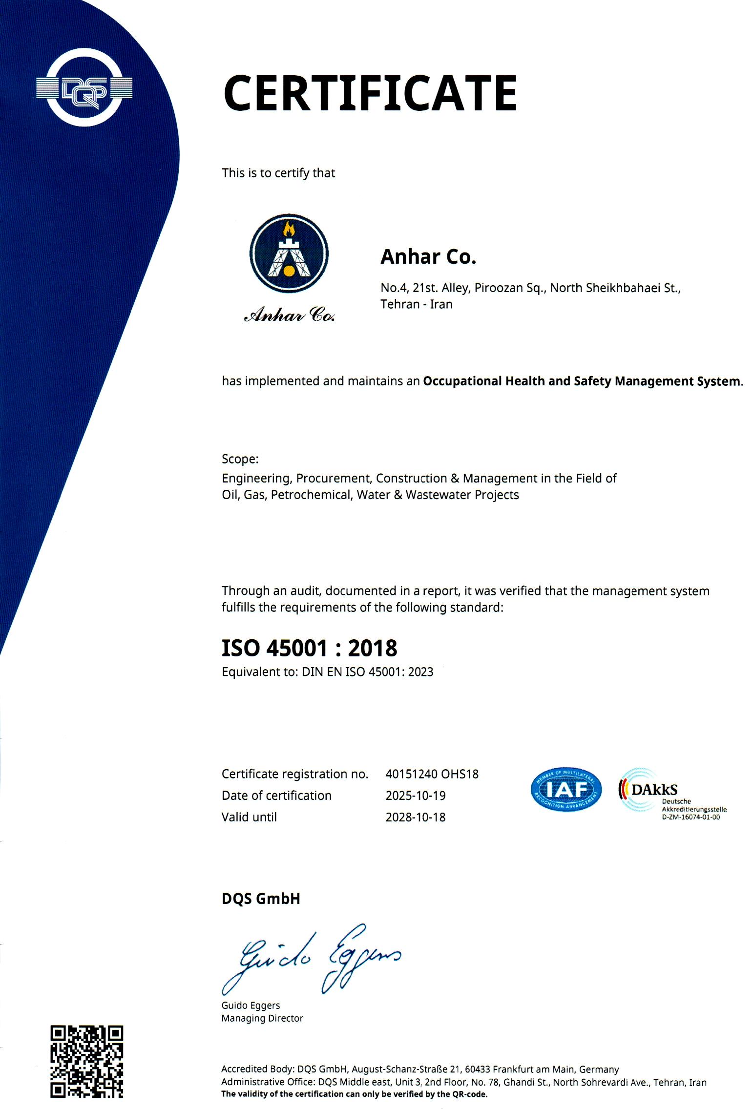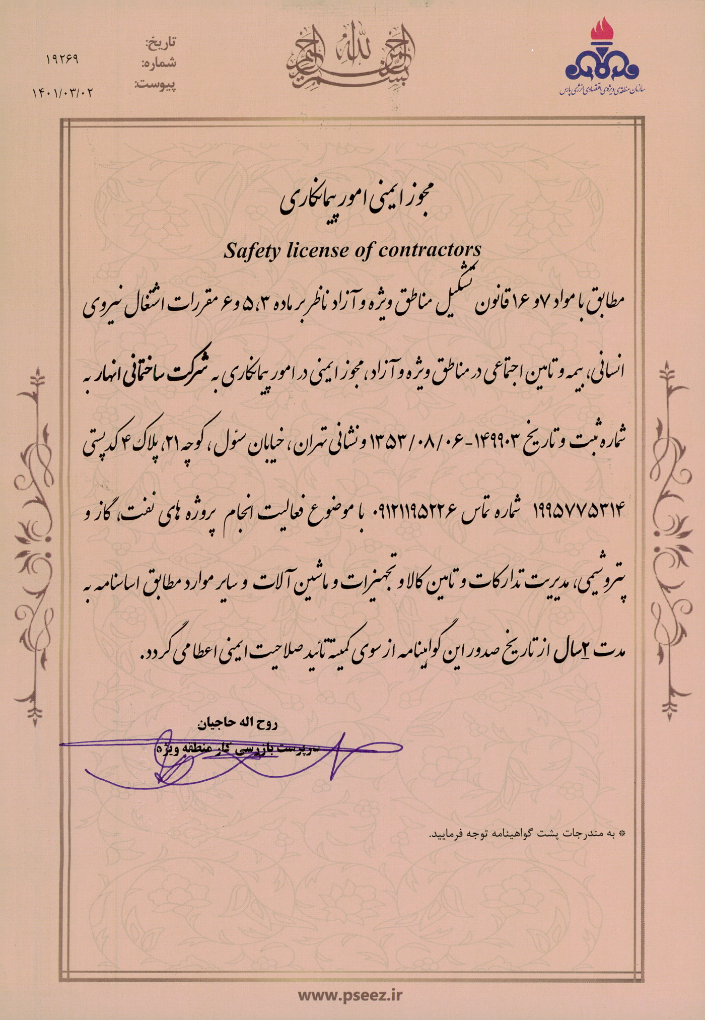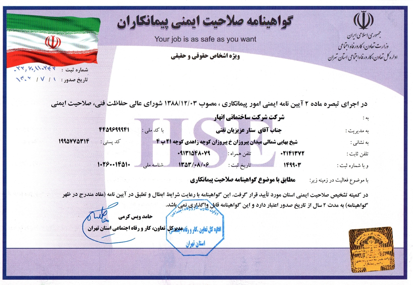 کما حازت علی شهادة تأهیل السلامة والأمان للمقاولین من قبل وزارة التعاون والعمل والرفاة الإجتماعي .